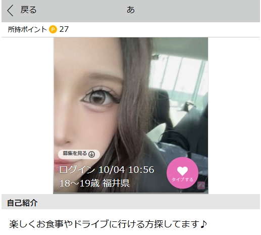 ハッピーメールは年齢確認がしっかりしているので、未成年トラブルは少ないですが、念のため相手のプロフィールをチェックしてくださいね。
