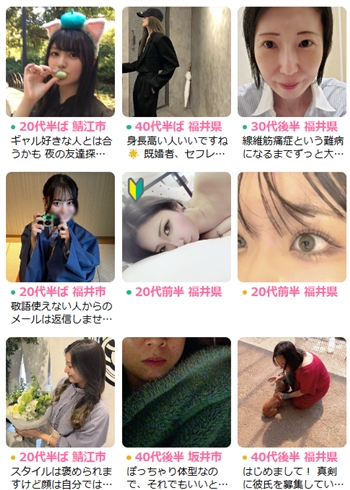 そこで、福井の女性が多いアプリを調べてみましたが、ワ〇ワクメールやハッ〇ーメール等の有名どころだと、セミプロ風俗嬢が多いようで避けた方が良さそうな感じです。